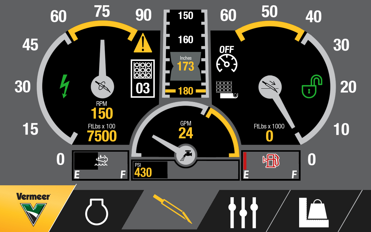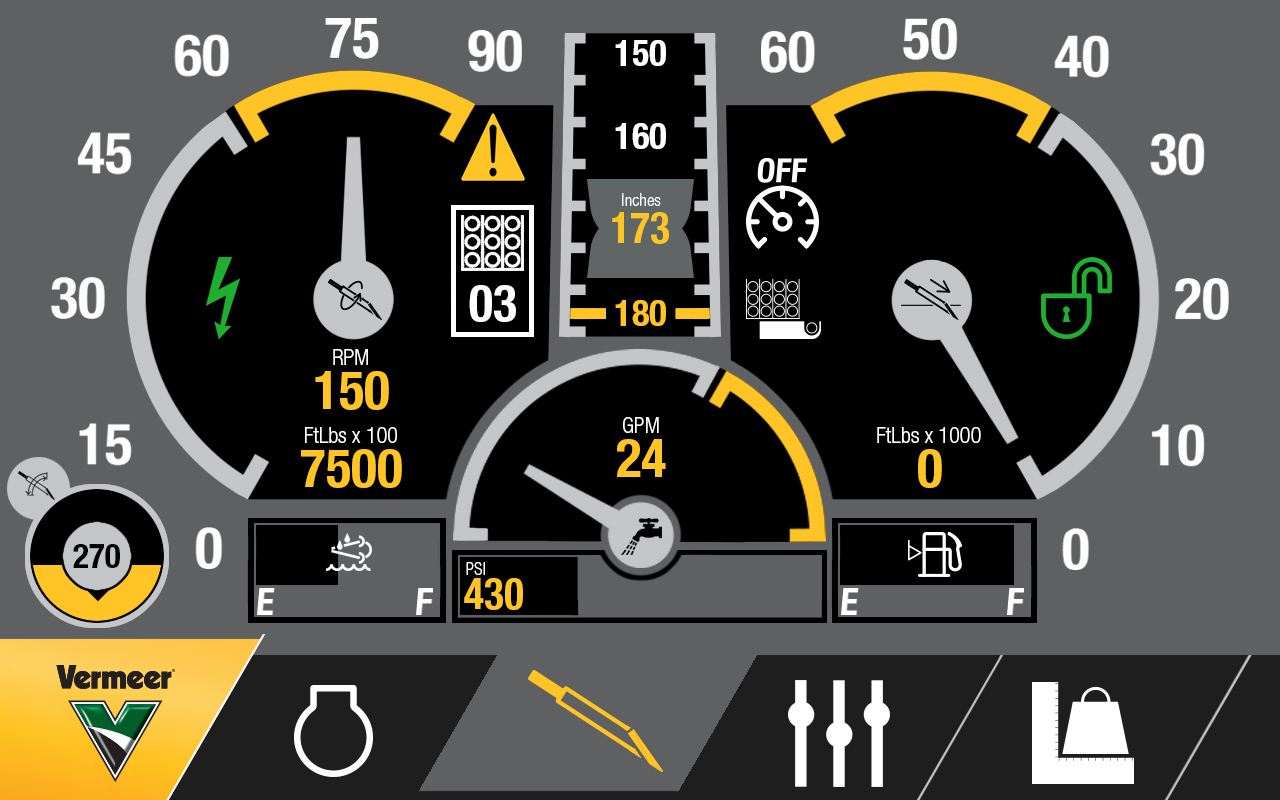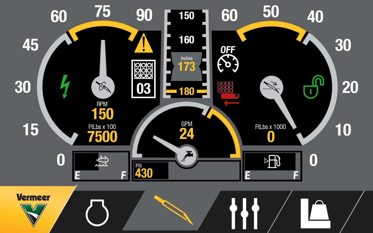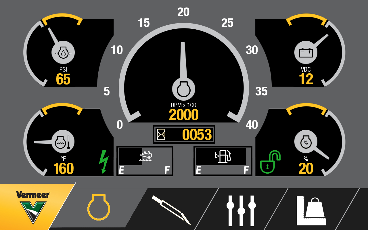 The original UI created for the previous generation of machines was extremely utilitarian. Not much attention had been paid to contrast or visual clarity. I was tasked with overhauling the design ethos for the next generation of machines as they would each be equipped with a much more powerful screen. Looking at what our operators are used to, I looked at the automotive industry and took inspiration from pickup truck dash boards to drive the initial concepts. Using a mostly flat, but slightly skeuomorphic design language helps convey to the operator at a glance what value is what and lets them quickly pick out the information they need.